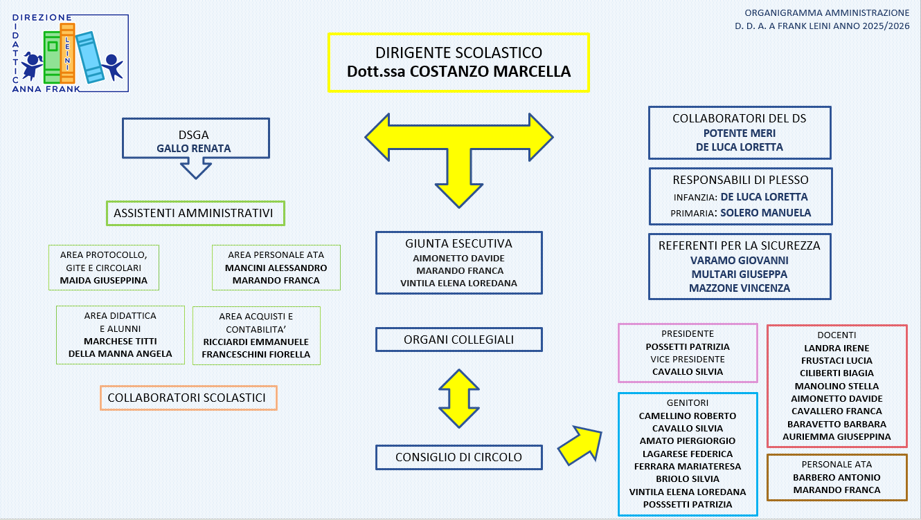 L’organigramma della Direzione Didattica Anna Frank descrive l’organizzazione del nostro Istituto e rappresenta una mappa delle competenze e delle responsabilità dei soggetti e delle loro funzioni. L’organigramma consente di descrivere l’organizzazione complessa dell’Istituzione scolastica, dove i soggetti e gli organismi operano in modo collaborativo e condiviso pur ricoprendo differenti ruoli e livelli di responsabilità gestionale con l’unica finalità di garantire un servizio scolastico di qualità e volto al benessere degli alunni.